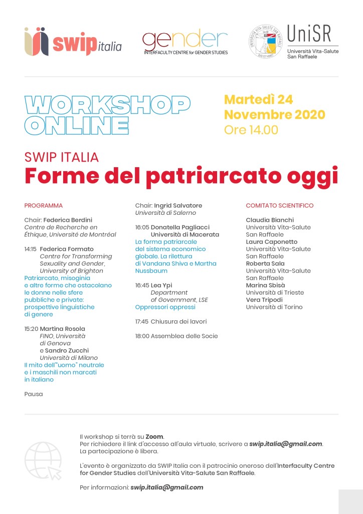 Il workshop è organizzato da SWIP Italia con il patrocinio oneroso dell’Interfaculty Centre for Gender Studies dell’Università Vita-Salute San Raffaele.