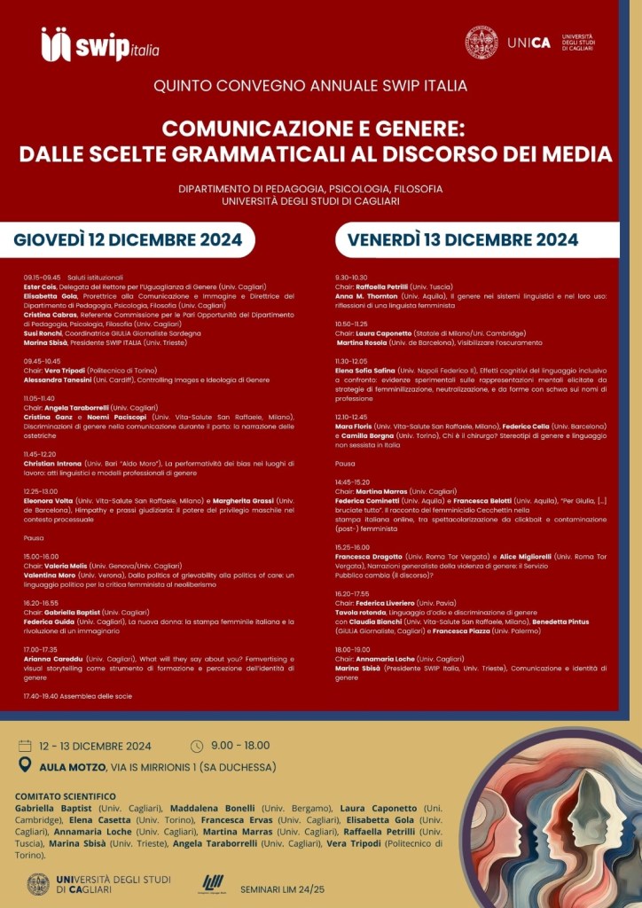09.15-09.45 Saluti istituzionali: Ester Cois, Delegata del Rettore per l’Uguaglianza di Genere (Università di Cagliari), Elisabetta Gola, Prorettrice alla Comunicazione e Immagine e Direttrice del Dipartimento di Pedagogia, Psicologia, Filosofia (Università di Cagliari), Cristina Cabras, Referente Commissione per le Pari Opportunità del Dipartimento di Pedagogia, Psicologia, Filosofia (Università di Cagliari), Susi Ronchi, Coordinatrice GIULiA Giornaliste Sardegna, Marina Sbisà, Presidente SWIP ITALIA (Università di Trieste)