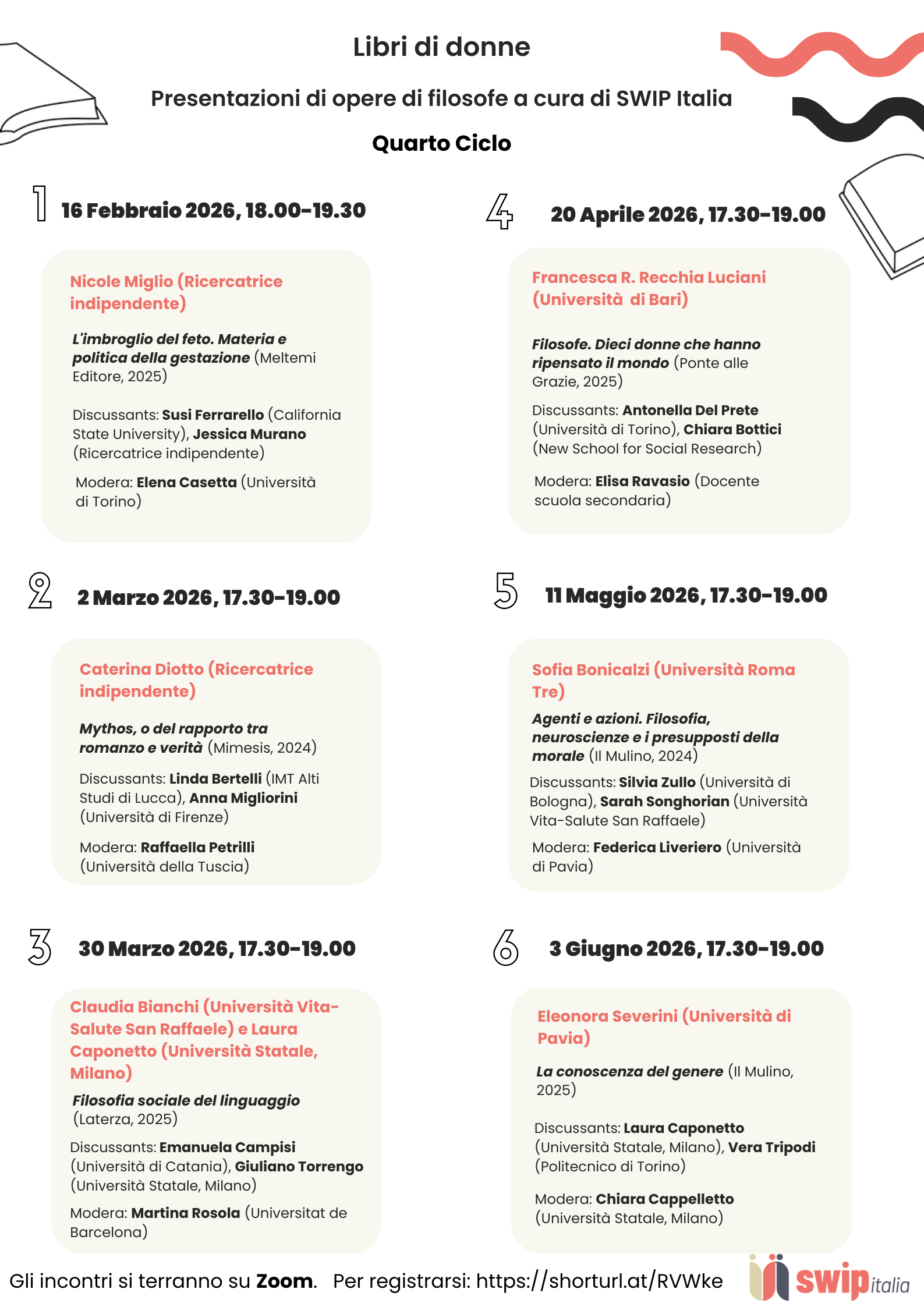 Da alcuni anni SWIP Italia organizza l’iniziativa: Libri di donne. Presentazioni di opere di filosofe.